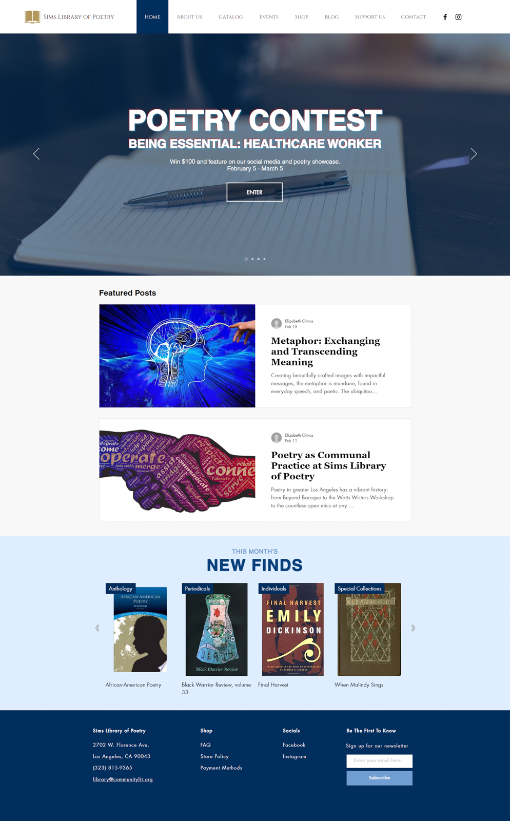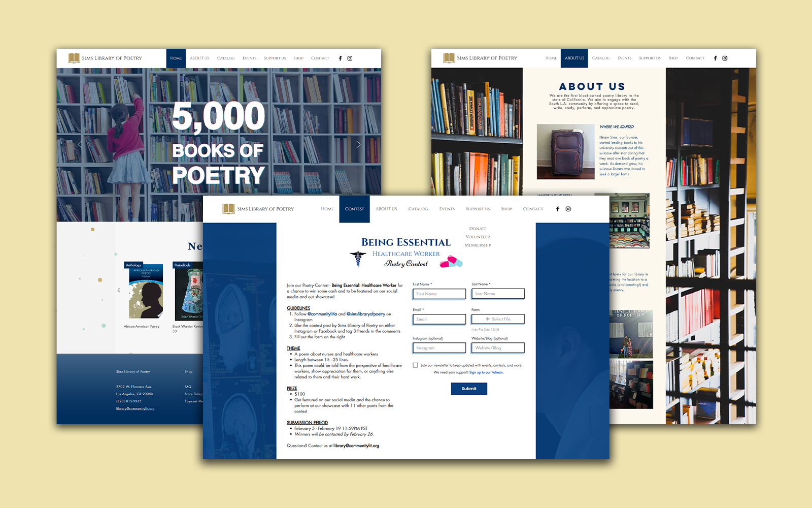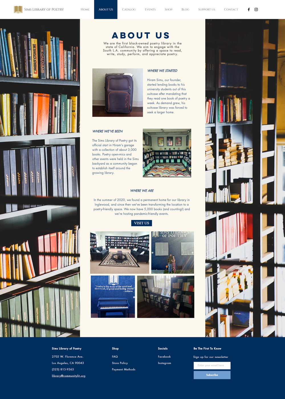 Owned by Community Literature Initiative, Sims Library of Poetry is the first black-owned poetry library in the state of California that offers a space to read, write, study, perform, and appreciate poetry to the South Los Angeles community. As the volunteer web designer, I was tasked with maintaining and updating the website which was created with Wix. Key design changes for pages that I have made include: