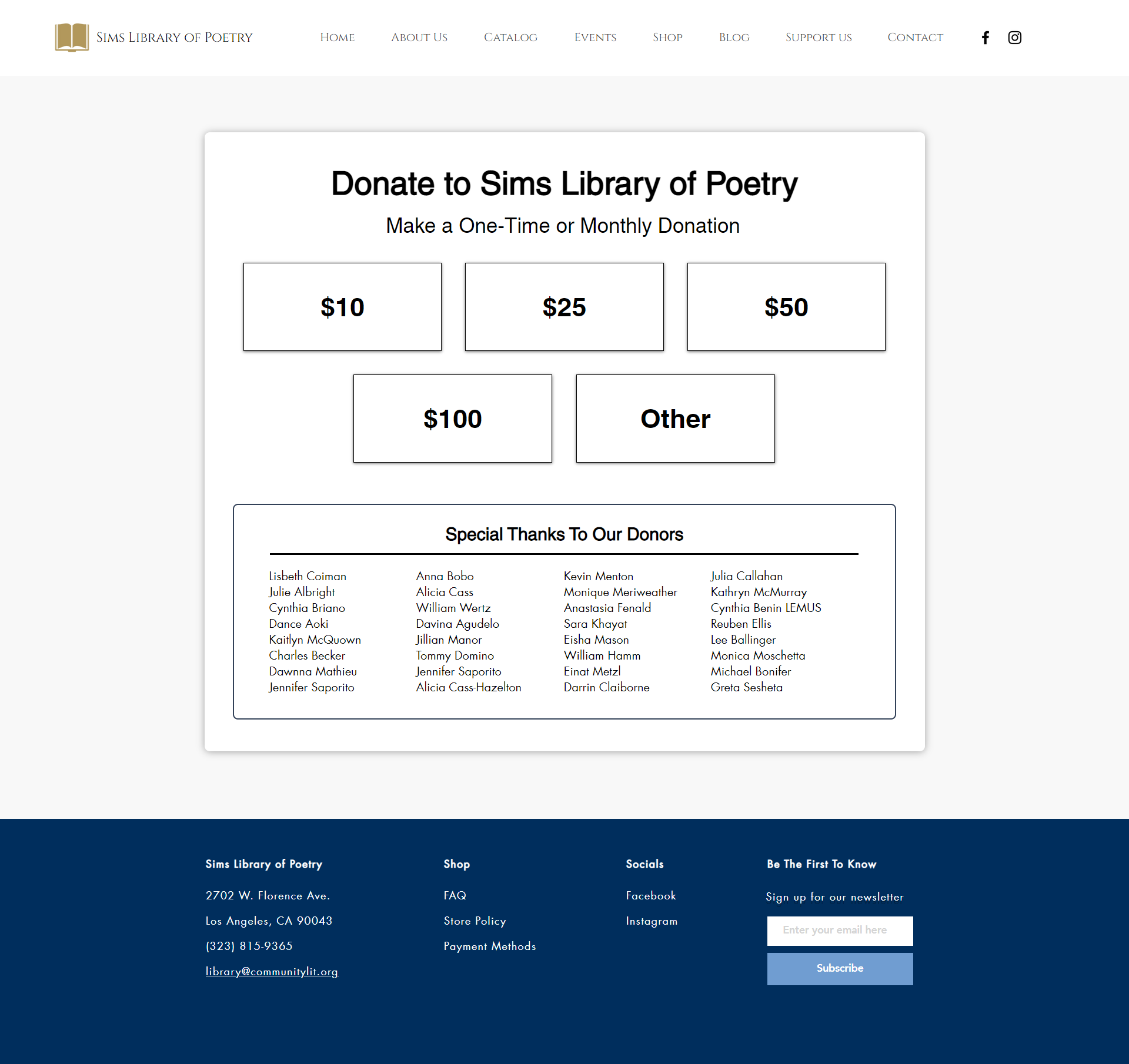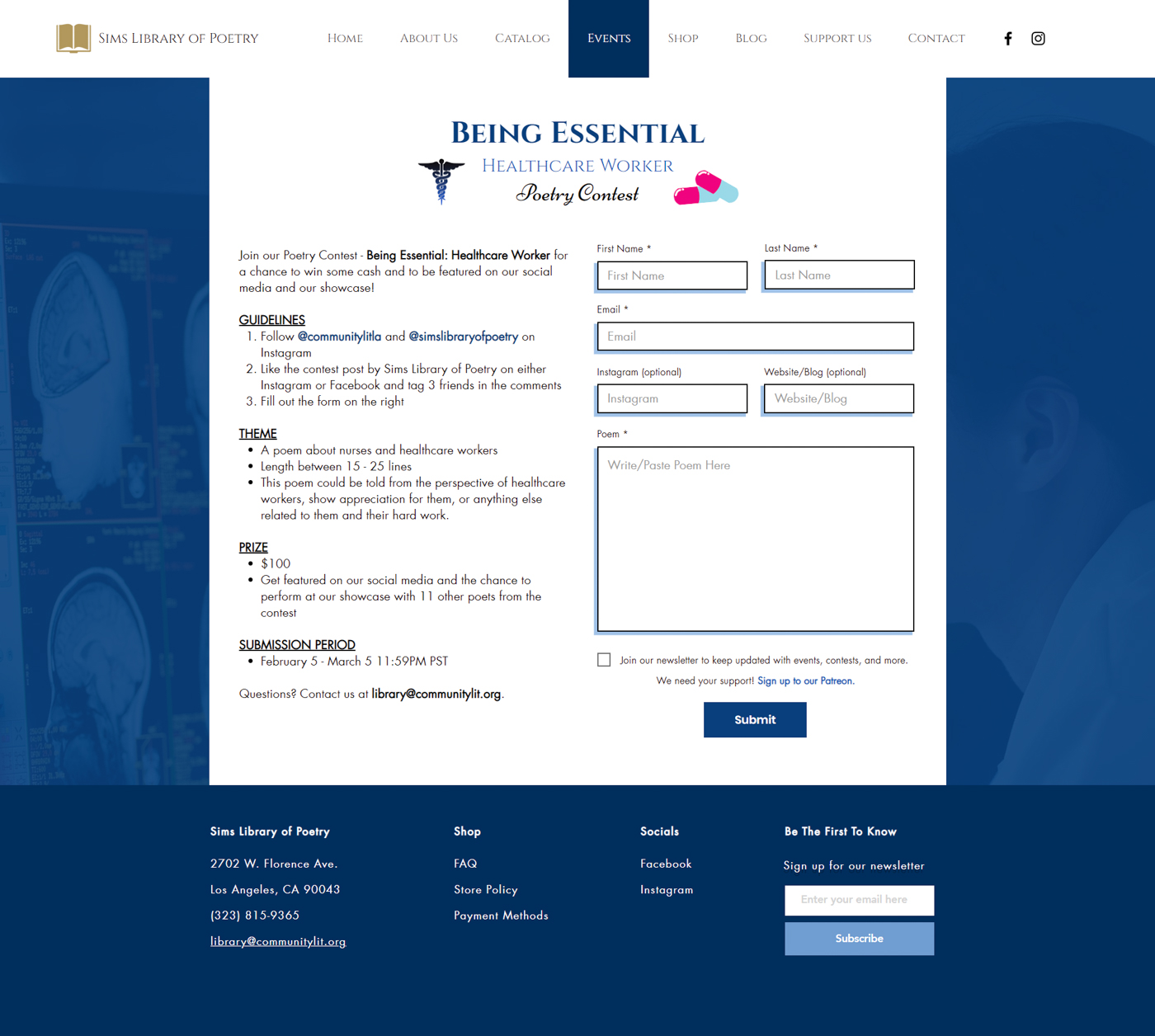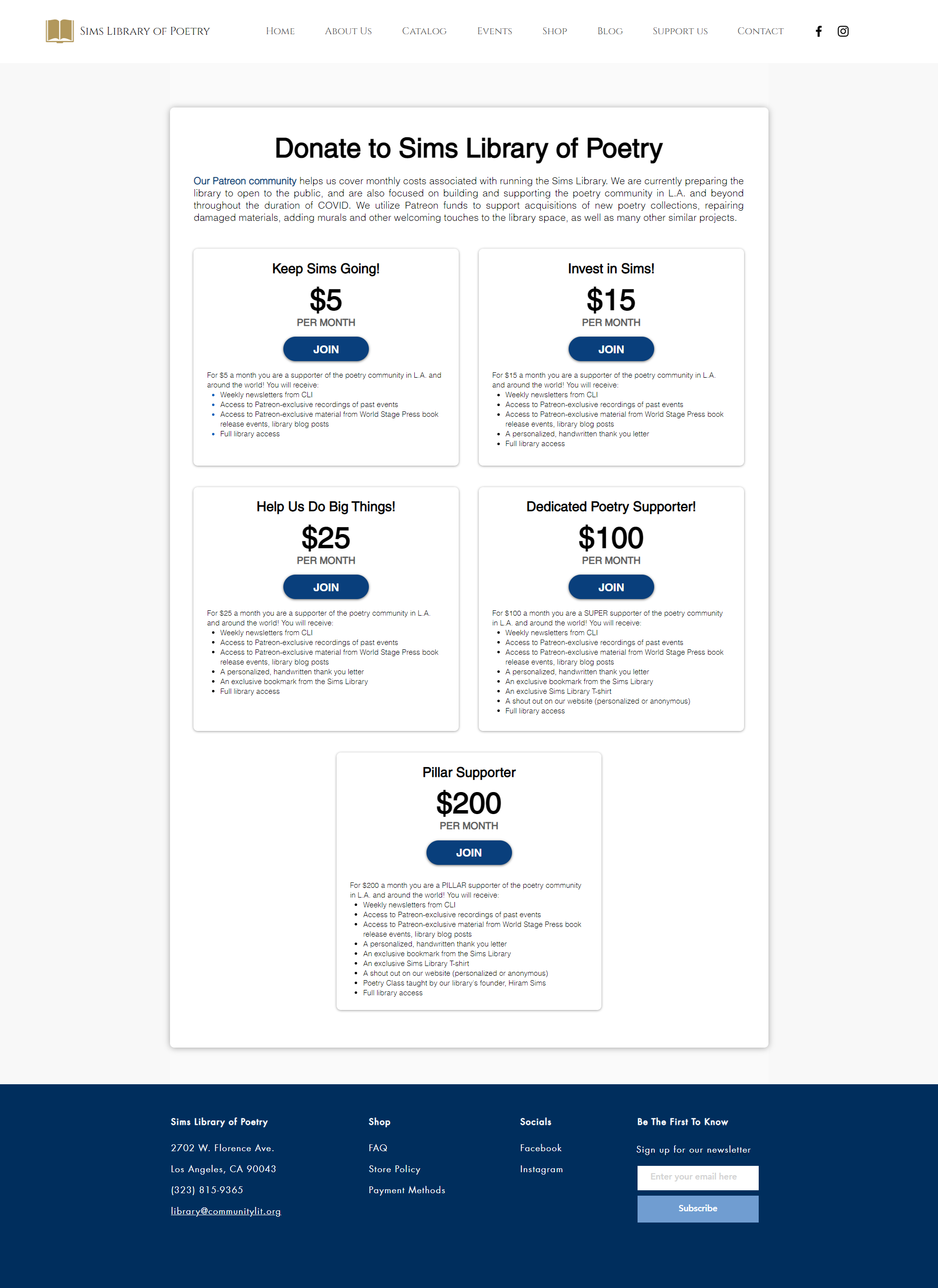 Owned by Community Literature Initiative, Sims Library of Poetry is the first black-owned poetry library in the state of California that offers a space to read, write, study, perform, and appreciate poetry to the South Los Angeles community. As the volunteer web designer, I was tasked with maintaining and updating the website which was created with Wix. Key design changes for pages that I have made include: